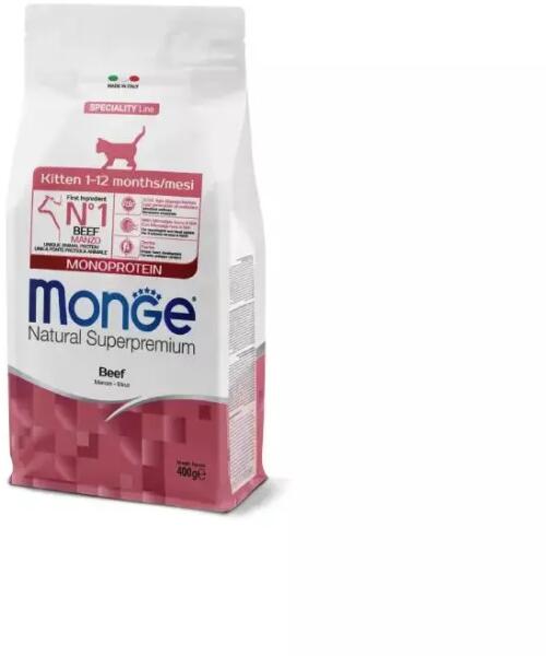 Monge Cat Speciality Line Monoprotein Kitten - BeefTeljes értékű, kiegyensúlyozott szárazeledel kölyök macskák számára. Kizárólag egyféle, friss marhából származó állati fehérjét tartalmaz, ami ízletessé és könnyen emészthetővé teszi. A megfelelő kálcium-foszfor aránynak köszönhetően elősegíti a kiegyensúlyozott növekedést. A termék xylo-oligoszacharideket é