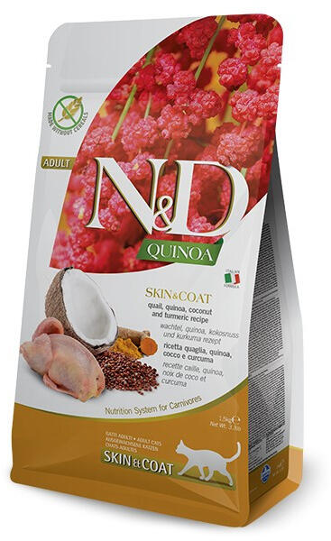 Fürj, quinoa, kókusz és kurkuma. Teljesértékű eledel felnőtt macskák számára. ÖSSZETEVŐK Friss fürj (18%), dehidratált fürj (18%), borsókeményítő, halolaj (heringből), quinoa mag (8%), lenmag, szárított kókusz (2,5%), kurkuma (2,5%) inulin, frukto-oligoszacharidok, élesztő kivonat (mannán-oligoszacharidok forrása), útifű, kalcium-karbonát, dikalcium-foszfát, kalcium-
