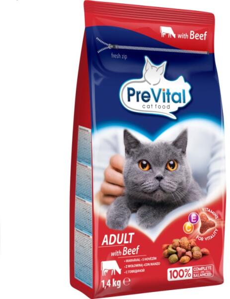Teljes értékű állateledel lakásban vagy házban élő felnőtt macskák számára marhával Elérhető kiszerelés: 300g és1,4kg Teljeskörű gondoskodás az elégedett dorombolásért A PreVital termékcsaládot úgy alkottuk meg, hogy a kölyökcicától az idősebb korúig, minden életkorban 100%-ban teljes értékű és kiegyensúlyozott eledellel táplálhassuk házi kedvenceinket. Min