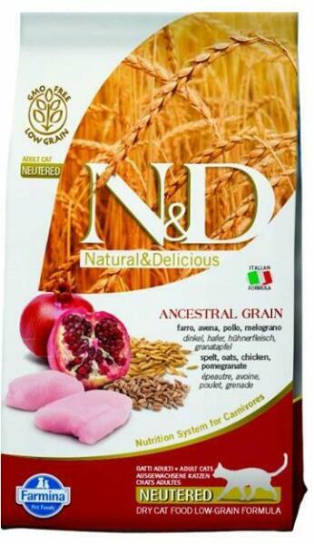 Teljes értékű macskaeledel felnőtt, ivartalanított macskák számára- Farmina N&D cat LG Neutered Chicken & Pomegranate 1,5 kg. Összetevők: friss csont nélküli csirkehús (24%), szárított csirkehús (24%), tönköly (10%), zab(10%), szárított tojás, friss hering, szárított hering, hidratált állati eredetű zsiradék , szárított répapép, csirke zsiradék, hal zsiradé