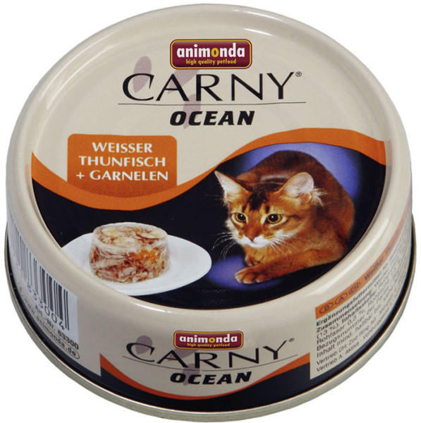 Animonda Carny Ocean (fehér tonhal + garnéla) nr. : 83300 Kiegészítő eledel felnőtt macskáknak. Kiszerelés: 80 g Egy könnyed étrend fontos cicabarátainknak, akik napjainkban általában egy otthonban élnek velünk. Mivel a halfehérje könnyű (a hal csak kis számban tartalmaz kötőszövetet), ezért különösen alkalmas közepes fizikai megterhetlés esetén. A Carny Ocean dobozaib