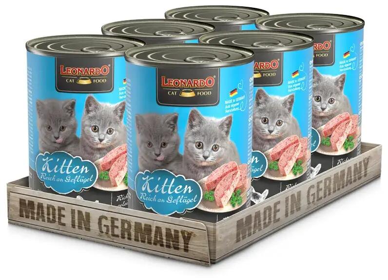 Leonardo Kitten baromfiban gazdag Mivel a házimacska vadon élő fajtársaihoz hasonlóan húsevő, a LEONARDO konzerveledeleinek célja a színhús-minőség nyújtása. Az élet tökéletes indításához. Porhanyós baromfival és egészséges adag lazacolajjal.
