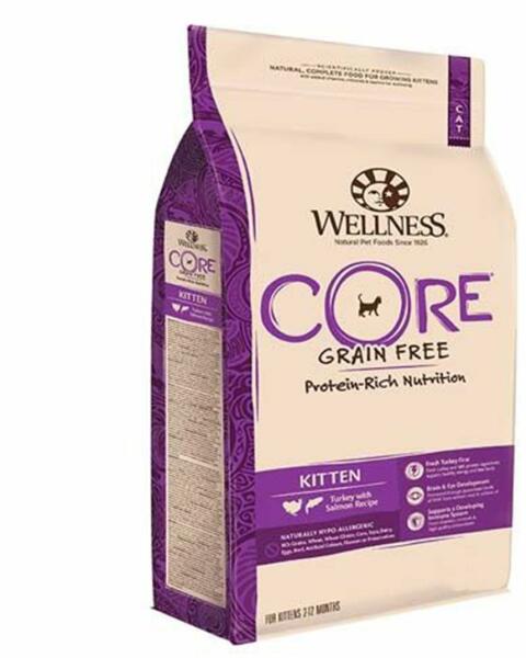 Wellness CORE természetes hipoallergén eledel friss pulykahúsból és lazacból kiscicák számára 2-12 hónapos korban. a friss halnak köszönhetően az eledel magas omega-3 és omega-6 zsírsav tartalmú a bőr és a bunda egészségének védelmére különleges recept kiscicák számára, hozzáadott vitaminokkal, antioxidánsokkal és ásványi anyagokkal az egészség és immunrendszer