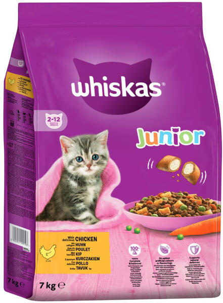 A zooplus. hu kínálatából: A Whiskas Junior csirke szárazeledelt speciálisan növekedésben lévő, 1 évesnél fiatalabb kiscicák valamint a vemhes és szoptató macskák táplálkozási igényeinek megfelelően fejlesztették ki. A növekedés szakasza különös jelentőséggel bír, hiszen akkor lehet és kell megalapozni az egészséges és hosszú macskaéletet. Fejlődésük időszak
