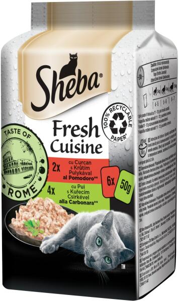 A Sheba Taste of Rome egy teljes értékű nedves eledel felnőtt macskák számára, amelyet Róma kulináris hagyományai szerint készítenek a legnagyobb ínyencek számára. teljes és kiegyensúlyozott nedves eledel felnőtt macskáknak 12 hónapos kortól a 6 kapszulából álló csomag 2 ízben tartalmaz - csirke és pulyka minden kapszula 1 adag friss húst képvisel ízletes lében álla