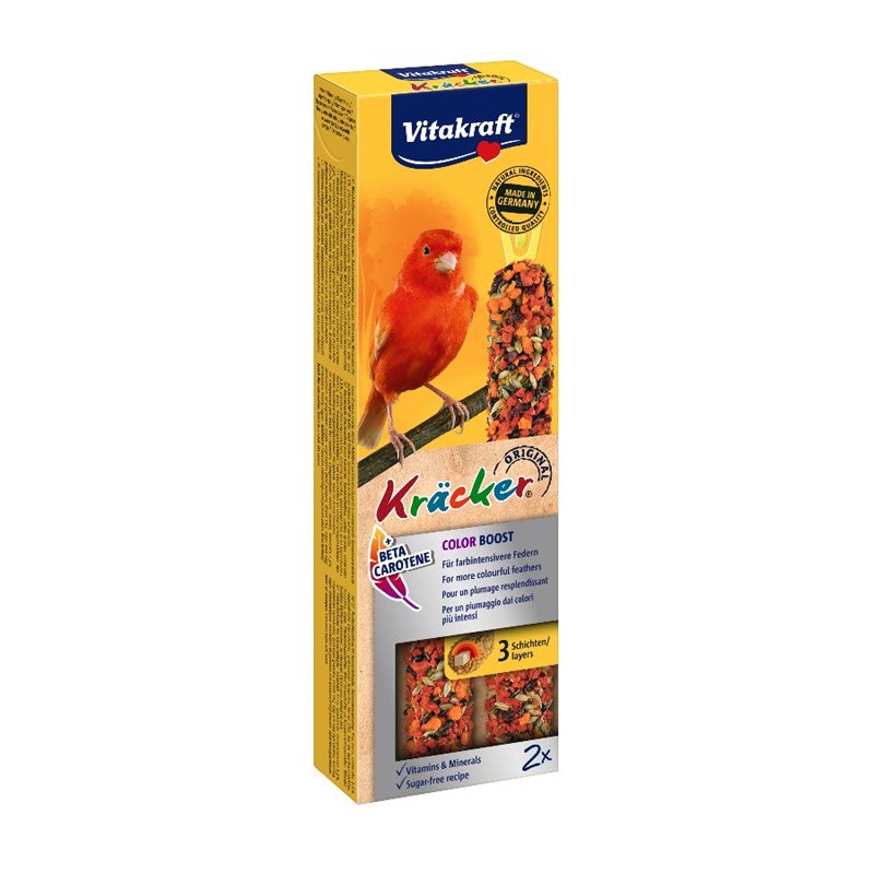 Az ellenállhatatlan Kracker® Color Boost nemcsak jó ízű, hanem értékes funkciót is kínál az állatoknak . Ez a változat béta-karotint tartalmaz, amely támogatja az intenzívebb színű tollazatot. Az ízletes gabonakeveréket három rétegben, természetes fán sütik. Ez extra hosszú csemegét nyújt a madaraknak a fajnak megfelelő foglalkozás mellett, mivel az állatok táplálé