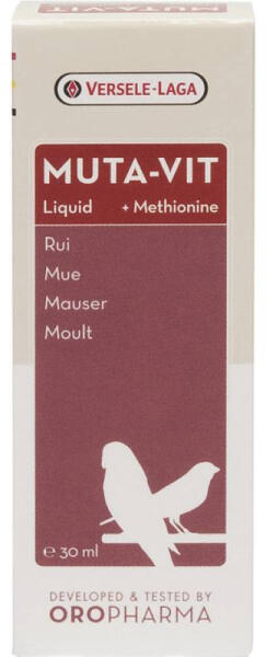 Kiszerelés: 30ml Versele-Laga Oropharma Muta-Vit Liquid Vedlést segítő , erőnlétjavító csepp díszmadaraknak. Multivitamin keverék a vedléshez , kondícionáláshoz methioinnal 14 féle vitamint , biotint , aminosavat tartalmaz. Az Oropharma Muta-Vit Liquid vitaminok és aminosavak folyékony keveréke, dúsítva metioninnal és ciszteinnel. Ezt a terméket kifejezetten a vedléshez terv