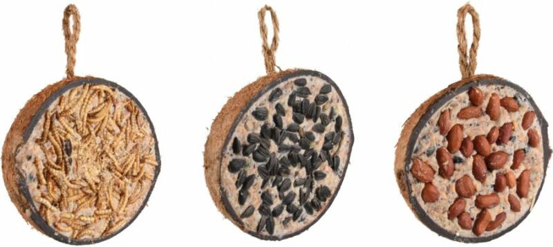 3 fél kókuszdió madáretető magvakkal és zsírokkal gazdagon megtöltve. Jellemzők: - 3 fél kókuszdió, gazdagon megtöltve magvakkal és zsírokkal:- 1 fél diófélékkel töltve. - 1 fél lisztkukacokkal töltve. - 1 fél napraforgómagokkal töltve. - Függesztő kötéllel a könnyű felakasztásért.