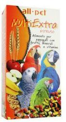 Madáreledel Minden MULTIEXTRA extrud. 0,6kg-os doboz, Extrudált papagájeledel (3 féle dió, gyümölcs, FOS). Összetevők: gabonafélék, gyümölcsök20%, diófélék, földimogyoró, datolya, banán, alma, mazsola, vedl. nőtt. termékek, nőtt. fehér. kivonatok, bányász. anyagok, olajok, vitaminok, fruktooligoszacharidok, yucca kivonat, L-lizin, metionin. Minőségi jellemzők: fehérje