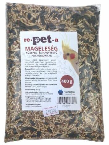 Repeta madáreleség Teljes értékű takarmány, amely megfelelő arányban tartalmazza a közepes- és nagyatestű papagájok számára szükséges magvakat. sszetétel: Vörös köles, sárga köles, fekete napraforgómag, iregi csíkos napraforgómag és zab megfelelő arányú keveréke. Alkalmazási útmutató: A magkeverék mellett mindig biztosítson friss, tiszta ivóvizet. Kizárólag ta