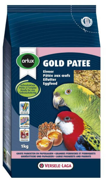 Kiszerelés: 1kg Versele Laga Orlux Gold Patee Parrot eggfood papagájok és nagypapagájok részére tojásos lágyeleség. A lágyeleség elengedhetetlen a tenyészidőszakban , de az év bármely szakaszában extra tápanyagok forrása. 100%ban természetes mézzel, csipkebogyóval , bogyókkal , mazsolával, gammarusszal dúsítva ami extra fehérje forrás. Extra hozzáadott lizinnel és meti