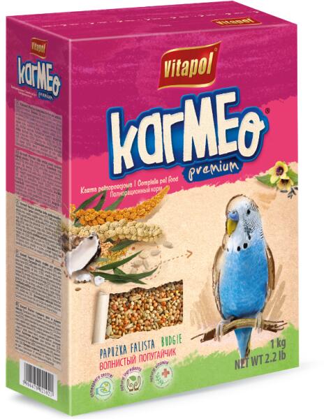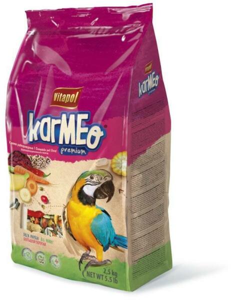 Vitapol Karmeo Premium Teljes értékű eledel nagytestű papagájok számára 2,5 kg - Termékleírás Teljes értékű eledel nagytestű papagájok számára. A Karmeo az alap Vitapol takarmánycsalád új, továbbfejlesztett receptje. A takarmányt tápanyagokban és pigmentekben gazdag, gyümölcsökön és lucernán alapuló extrudált összetevőkkel dúsították. A madarak jobb kondíciój