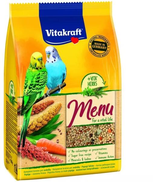 Minden adalékanyagtól mentes, teljes értékű eledel vitaminokkal és ásványi anyagokkal hullámos papagájok részére. A VITA®HERBS – gondosan válogatott gyógynövény keverék petrezselyemmel, lándzsás utifűvel, kakukkfűvel, melyek támogatják a madár jólétét. Összetétel: gabonafélék ( köles 89.2%), egyéb magvak 3.5%, ásványi sók, zöldség ( szárított sárgarépa