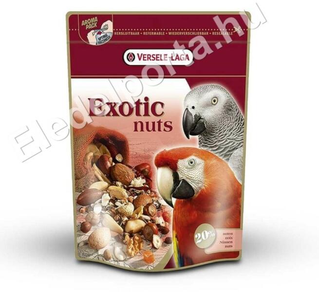 Az Versele-Laga Exotic Nuts a papagájok kedvenc csemegéje. Alig várják, hogy megtömhessék a begyüket a különböző egész diófélékkel (köztük mandulával, dióval és pekándióval), és élvezhessék a gabonaszemek és magvak gazdag kavalkádját. Adja nekik az Exotic Nuts -ot eledelként, jutalomként vagy valamelyik Versele-Laga magkeverékkel – így lesznek boldog és egészsé