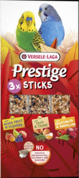Versele Laga Prestige Sticks Tripla Rúd – kiegészítő eleség hullámos papagájok részére (3db/90g) Mesterséges tartósítószertől, színezéktől és aromától mentes. Osztriga héjjal dúsított. Új összetevőkkel. Tartalmaz: 3db sült magvas rúd (1 db zöldség és pitypanglevél, 1 db vegyesgyümölcs és virág, 1 db tojás és kakukkfű)
