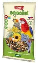 Darwin's Medium Papagáj Special 1kg, Teljes értékű eledel közepes méretű papagájok számára, megnövelt vitamintartalommal. Összetevők: magvak, gabonafélék, növényi eredetű fehérjekivonatok, élesztő, ásványi anyagok, tojás és tojástermékek, hal és hal melléktermékek, olajok és zsírok. Adalékanyagok/kg: vitaminok: A-vitamin 10.000 m. j. , vit D3 500 m. j. , vit E (alf