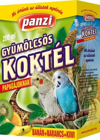 200ml Egészséges, magas gyümölcstartalmú csemege papagájoknak. Köleses, fénymagos, banános, narancsos, kiwis, sárgarépás golyóscskák. A koktél etetésével kedvencünk táplálkozása természetesebb lesz, amit madarunk viselkedésén, tollazatán vehetünk észre. A papagájok eredeti lakóhelyén található gyümölcsök felhasználásával készült keverék.