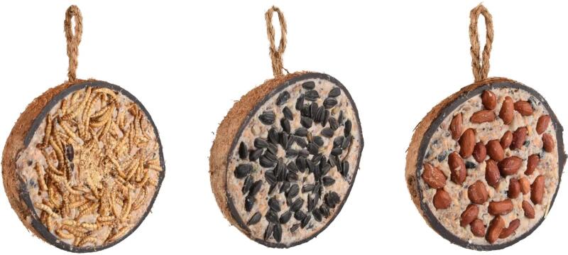 Jellemzők: - 3 fél kókuszdió, gazdagon megtöltve magvakkal és zsírokkal: - 1 fél diófélékkel töltve. - 1 fél lisztkukacokkal töltve. - 1 fél napraforgómagokkal töltve. - Függesztő kötéllel a könnyű felakasztásért.