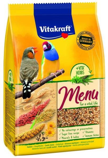 Minden adalékanyagtól mentes, teljes értékű eledel vitaminokkal és ásványi anyagokkal exotikus madarakrészére. Mesterséges színezéket és tartósítószert nem tartalmaz. Cukormentes termék. A VITA®HERBS – gondosan válogatott gyógynövény keverék petrezselyemmel, lándzsás utifűvel, kakukkfűvel, melyek támogatják a madár jólétét. Vitamin tartalma véd a hiánytünetek