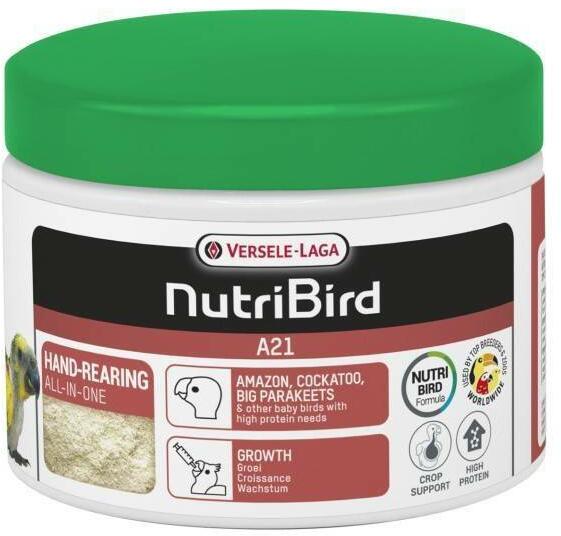 A NUTRIBIRD A21 kézzel nevelhető eledel amazonok, kakaduk, nagytestű papagájok és más, magas fehérjeszükségletű fiatal madarak számára. Tudományosan jóváhagyott összetétel, amely minden tápanyagot tartalmaz, amire a fiókának szüksége van. Optimális növekedést biztosít a teljesen egészséges fiatal madarak számára. A kikeléstől az elválasztásig használható. - Bél