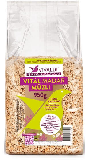 A Vivaldi Vitál madármüzli remek választás a kert madarainak egész éves etetésére. Az 500 grammos kiszerelésű madáreleség bőségesen tartalmaz vitaminokat és ásványi anyagokat, amelyek hozzájárulnak a madarak egészségéhez és energiaszintjük fenntartásához. Kiváló minőségű összetevői biztosítják a szükséges tápanyagokat, így a madarak aktívak és életerősek