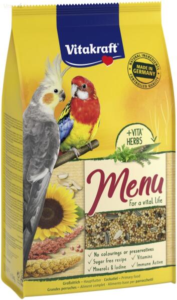 A Vitakraft Menü mézes, vitaminos egy teljes értékű táplálék hullámos papagájok számára. Összetétel: Gabonafélék 93%, vetőmagok 3.5%, ásványi anyagok, zöldségek (répa, szárított 1%), vágott eukaliptusz-levelek 0.2%, olajok és zsírok, növényi eredetű származékok, méz 0.02%, élesztő (béta-glükán 80mg/kg). Ajánlott adagolás: naponta 1-2 teáskanálnyi mennyisé