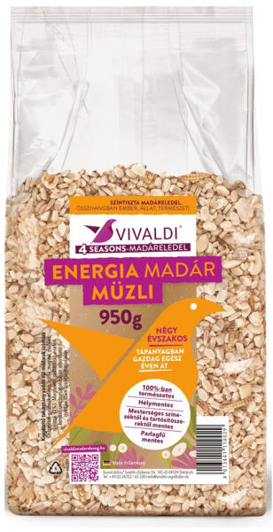 A Vivaldi Energia madármüzli ideális választás a kert madarainak téli etetésére. A 950 grammos kiszerelésű madáreleség magas energiatartalmú, így segít a madaraknak átvészelni a hideg hónapokat. Kiváló minőségű összetevői biztosítják a szükséges tápanyagokat és energiát, így a madarak egészségesek és aktívak maradnak. A termék szárított bogyókat és blansí