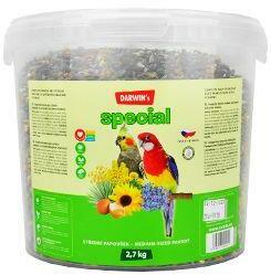 Darwin's Medium Papagáj Special vödör 2,7kg, Teljes értékű takarmány közepes papagájok számára Termékleírás teljes értékű takarmány közepes papagájok számára megnövelt vitamintartalommal vitaminokkal dúsított magkeverék állati komponenssel dúsítva praktikus vödörbe csomagolva Összetevők: magvak, gabonafélék, növényi eredetű fehérjekivonatok, élesztő, ásvá