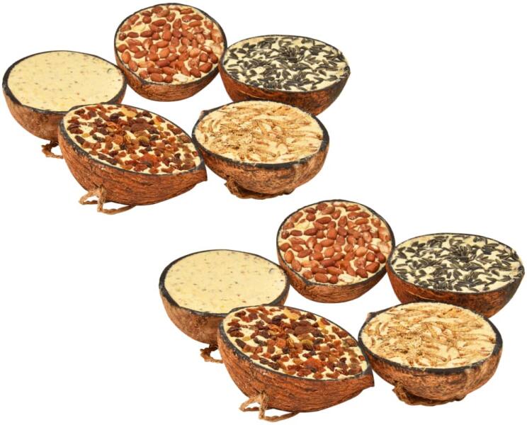Az öt variációt tartalmazó, madáreledellel töltött 10 darab kókuszdiófél a zsír és fehérje prémium minőségű keveréke, extra energiát szolgáltatva a vadon élő madarak számára. A minőségi alapanyagok, mint a magvak, a lisztbogár, a mazsola és a földimogyoró, arányosan vannak jelen, hogy nagy hatékonyságú olajat és fehérjét nyújtsanak, amelyek energiát biztosít