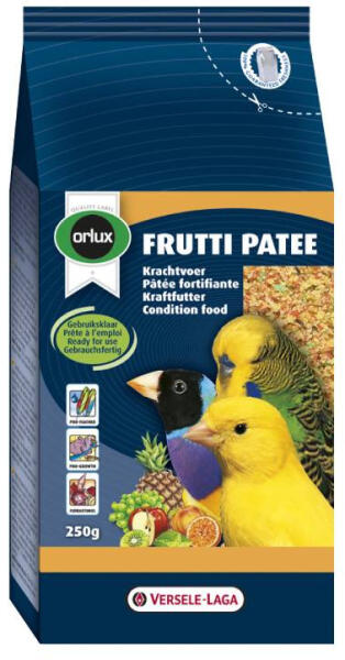 Kiszerelés: 250gr Versele Laga Orlux Frutti Patee eggfood gyümölcsös lágyeleség pintyek, kanárik, és papagájok részére. Kész gyümölcsös lágyeleség pintyek, kanárik, és papagájok részére. A lágyeleség elengedhetetlen a tenyészidőszakban , de az év bármely szakaszában extra tápanyagok forrása. 100%ban természetes mézzel megnedvesítve, gyümölcs darabokkal. Extra ho