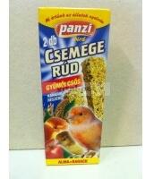 Panzi Gyümölcsös Csemege Rúd kanárik részére (2db) Ízletes csemege kedvencünknek, kalandosan finom ízű táplálék kiegészítő, amely vitamindús gyümölcsök felhasználásával készült. Összetevők: fehér köles, repce, fénymag, muharmag, kender, alma, barack Analitikai összetétel: nedvesség: 11%, nyers fehérje: 14,1%, nyers zsír: 12,4%, nyers rost: 6,7%, hamu: 2,8%