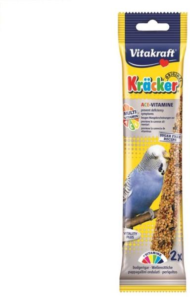 A Vitakraft Kracker dupla rúd egy vitaminokban és ásványi anyagokban gazdag csemege hullámos papagájoknak. Felhasználási útmutató: Legjobb, ha mindig van egy rúd a ketrecben. Összetétel: gabona, ásványi anyagok, növényi származékok, méz, gyümölcsök, olajok és zsírok, alga. Adalékanyagok/kg: A-vitamin 8.600NE, D3-vitamin 630NE, C-vitamin 400mg, E-vitamin 90mg. Színezéket