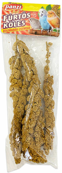 Díszmadár csemege fürtös kölesA köles amellett hogy egy természetes tápláló és egészséges finomság remek szórakozást nyújt a madaraknak ha egész fürtökben lógatjuk be kalitkájukba Tartósan lefoglalhatunk vele kanárit papagájt pintyféléket egyéb madarat ezzel is javítva közérzetétösszetétel100 természetes fürtös kölestartalma 70g