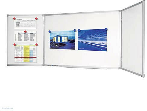 Nagy írófelülettel rendelkező fehértábla oldalszárnyakkal. Középső test 150x100 cm és jobb vagy bal oldalra szerelt szárny mérete: 75x100 cm. Zománcozott acél felület, mágneses, táblafilccel írható és szárazon letörölhető. Alumínium keret, világosszürke sarkokkal és fém filctoltartóval. A felszereléshez szükséges kiegészítőkkel, a filctartóval és a szerelési