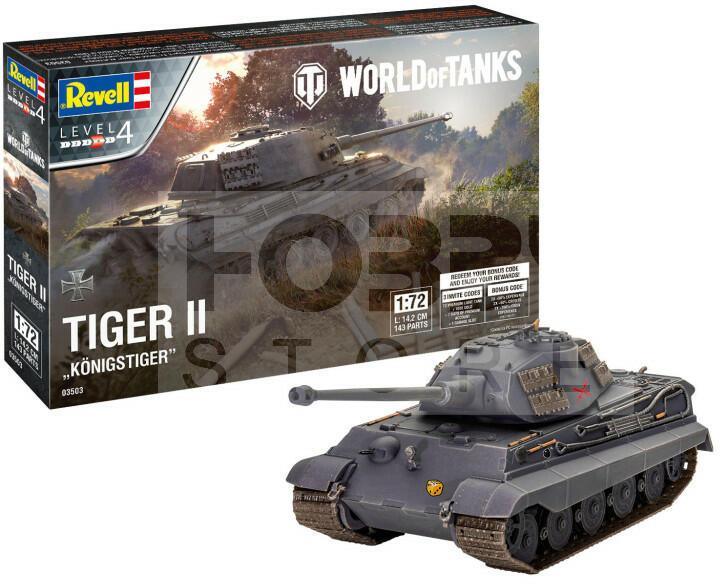 Revell Tiger II Ausf. B Königstiger (World of Tanks) 1:72 harcjármű makett 03503R Makett méretarány: 1:72 Alkatrész darabszám: 143 Makett hossúság: 14,2 cm Festést és ragasztást igénylő műanyag makett. A szükséges kiegészítőket, mint festék, ragasztó a készlet nem tartalmazza . Gyártó: Revell A Revell tradicionális nagy múltú makett gyártó. Már több mint 60 éve ká