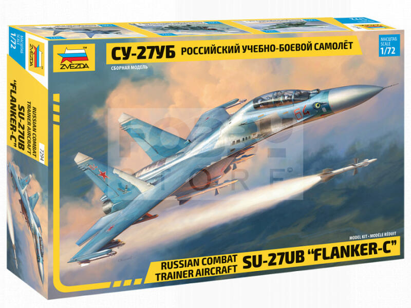 Zvezda Sukhoi SU-27 UB makett 1:72 (7294Z) Makett méretarány: 1:72 Alkatrész darabszám: 178 Makett hosszúsága: 31,4 cm A Zvezda a kiváló műanyag modelljei kapcsán vált világszerte ismerté. Makettei a legnépszerűbb méretarányokban érhető el. Elsősorban 2. világháborús gépezetek és kiegészítőik kapcsán érdemes megemlíteni a nevét, de a történelmi makettekből is sz