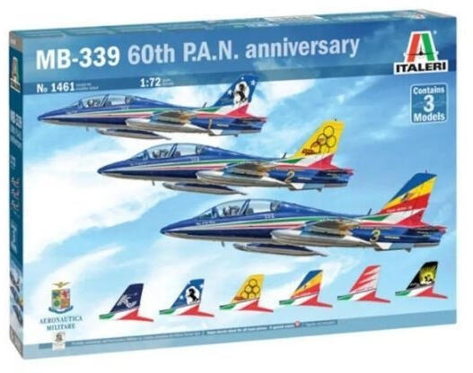 1:72 méretarányú MB 339 PAN 60. évforduló vadászbombázó makett. Az Aermacchi MB-339 egy modern olasz sugárhajtású kiképzőgép és vadászbombázó. A gép 1979-ben lépett az olasz légierő szolgálatába, fokozatosan felváltva az MB-326-ot. Az MB-339-es repülőgépnek több változata készült. Az egyik első az MB-339RM - radarral van felszerelve. Az MB-339C egy teljesen új rep
