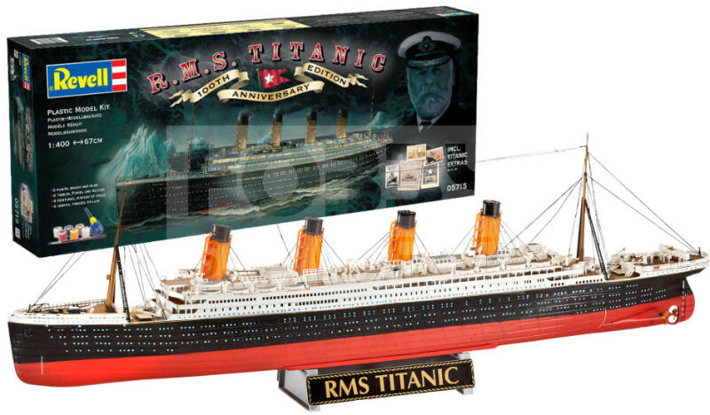 Revell Gift Set - R. M. S. Titanic - 100th Anniversary Edition 1:400 hajó makett 05715R Makett méretarány: 1:400 Alkatrész darabszám: 262 Makett hosszúság: 67 cm Festést és ragasztást igénylő műanyag makett. A készlet az alap színeket (Revell Aqua Color), ragasztót illetve ecsetet tartalmaz . Gyártó: Revell A Revell tradicionális nagy múltú makett gyártó. Már több mint 60
