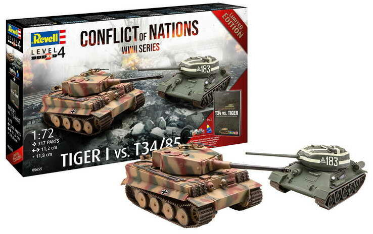 Üdvözöljük a Nemzetek konfliktusában: Világháborús exkluzív készlet, egy egyedülálló lehetőség a történelem és a modellépítés szerelmeseinek. Ebben a készletben két első osztályú, 1:72 méretarányú modellkészletet találsz - a legendás T-34/85-öt és a rettegett Tiger I-t. Az összesen 317 alkatrészből álló készletben nagy részletességgel készítheted el ezek