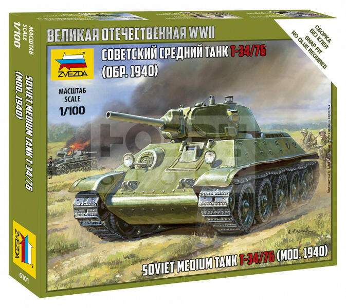 Zvezda Soviet Medium Tank T-34/76 makett 1:100 (6101Z) Makett méretarány: 1:100 Alkatrész darabszám: 5 Makett hosszúsága: 5,9 cm A Zvezda a kiváló műanyag modelljei kapcsán vált világszerte ismerté. Makettei a legnépszerűbb méretarányokban érhető el. Elsősorban 2. világháborús gépezetek és kiegészítőik kapcsán érdemes megemlíteni a nevét, de a történelmi makettekb