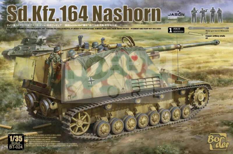 Border Model Sd. Kfz. 164 Nashorn Early/Command w/4 figures makett 1:35 (BT024) Makett méretarány: 1:35 A Border Model neve részletes műanyag modelleik kapcsán vált híressé. Jó minősége és részletgazdag kidolozottsága miatt népszerű a makettezők körében. Főleg katonai harcjárművek és repülők találhatóak meg kínálatukban. Könnyű összeszerelhetősége által jó vála