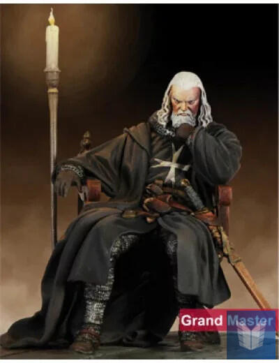 Jó kategóriás 75mm-es festetlen figura. This figure kit includes pieces of white metal to make a 75mm Grand Master. The master is the highest authority of a warrant, with almost absolute power, both militarily and political or religious. He was elected by the council, composed of thirteen monks, from whence they derive their name thirteen components. The office of Master is for life, and his de