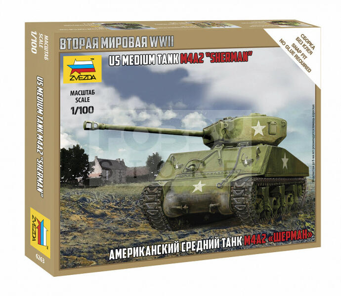Zvezda Sherman M4 makett 1:100 (6263Z) Makett méretarány: 1:100 Alkatrész darabszám: 26 Makett hosszúsága: 12 cm A Zvezda a kiváló műanyag modelljei kapcsán vált világszerte ismerté. Makettei a legnépszerűbb méretarányokban érhető el. Elsősorban 2. világháborús gépezetek és kiegészítőik kapcsán érdemes megemlíteni a nevét, de a történelmi makettekből is széles p