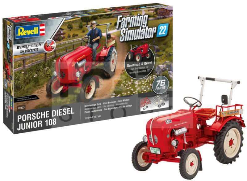 Revell Easy Click Porsche Junior 108 Farming Simulator Edition 1:24 traktor makett 07823R Makett méretarány: 1:24 Alkatrész darabszám: 76 Makett hossúság: 10,7 cm Festést igénylő műanyag makett. A szükséges kiegészítőket, mint festék, ragasztó a készlet nem tartalmazza . Gyártó: Revell A Revell tradicionális nagy múltú makett gyártó. Már több mint 60 éve kápráztatja e