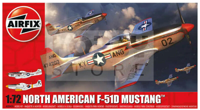 Airfix North American F-51D Mustang repülőgép makett 1:72 (A02047A) Makett méretarány: 1:72 Alkatrész darabszám: 72 Makett hossúság: 13,6 cm Festést és ragasztást igénylő műanyag makett. A szükséges kiegészítőket, mint festék, ragasztó a készlet nem tartalmazza . Gyártó: Airfix Az Airfix egy tradicionális brit fröccsöntött műanyag makett gyártó cég. Az Egyesült Ki