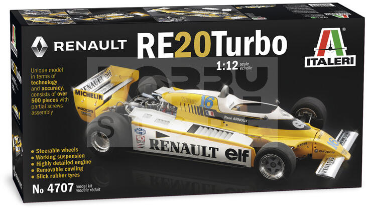 Italeri RENAULT RE 20 Turbo 1:12 autó makett 4707IT Makett méretarány: 1:12 Az Italeri makett gyártó cég több mint 60 éve kápráztatja el a makettezni vágyókat műanyag termékeikkel. Történelmi maketteik megalkotását pontos kutatási munkák előzik meg, így válhattak ennyire népszerűvé. Ugyanakkor széles termékpaletta jellemzi őket: a modern gépjárművek szerelmeseitől