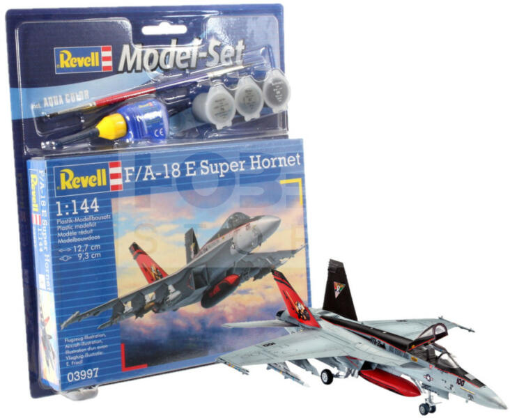 Revell Model Set - F/A-18E Super Hornet 1:144 repülőgép makett 63997R Makett méretarány: 1:144 Alkatrész darabszám: 63 Makett hossúság: 12,7 cm Festést és ragasztást igénylő műanyag makett. A készlet az alap színeket (Revell Aqua Color), ragasztót illetve ecsetet tartalmaz . Gyártó: Revell A Revell tradicionális nagy múltú makett gyártó. Már több mint 60 éve kápráztat