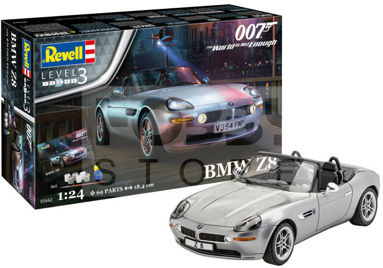 Revell Gift Set BMW Z8 - James Bond 007 The World Is Not Enough 1:24 autó makett 05662R Makett méretarány: 1:24 Alkatrész darabszám: 70 Makett hosszúság: 18,4 cm Festést és ragasztást igénylő műanyag makett. A készlet az alap színeket (Revell Aqua Color), ragasztót illetve ecsetet tartalmaz . Gyártó: Revell A Revell tradicionális nagy múltú makett gyártó. Már több mint 60