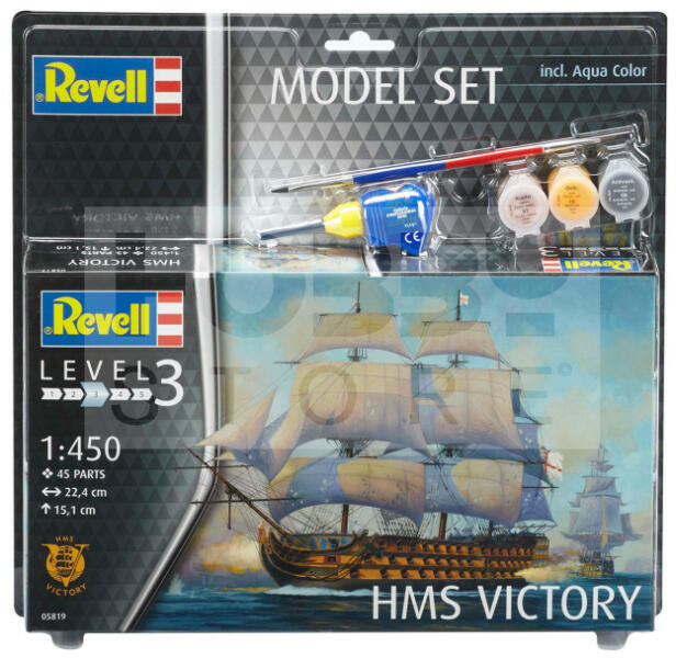 Revell Gift Set HMS Victory 1:450 hajó makett 65819R Makett méretarány: 1:450 Alkatrész darabszám: 45 Makett hosszúság: 22,4 cm Festést és ragasztást igénylő műanyag makett. A készlet az alap színeket (Revell Aqua Color), ragasztót illetve ecsetet tartalmaz . Gyártó: Revell A Revell tradicionális nagy múltú makett gyártó. Már több mint 60 éve kápráztatja el a rajongóit
