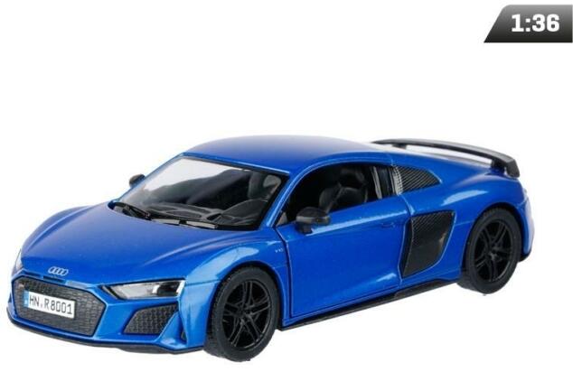 Modell 1:36, Kinsmart, Audi R8 Coupe (2020). A modell fémből és műanyagból készült, visszahúzó hajtással, 1:36 méretarányú. Nyíló oldalajtókkal rendelkezik, amelyeken keresztül bele lehet nézni a modellbe, és gumiabroncsokkal rendelkezik. A modell méretei kb. : 12,5 cm x 6 cm x 3,5 cm . A modell 3 évesnél idősebb gyermekek számára készült. A termék CE európai minőség